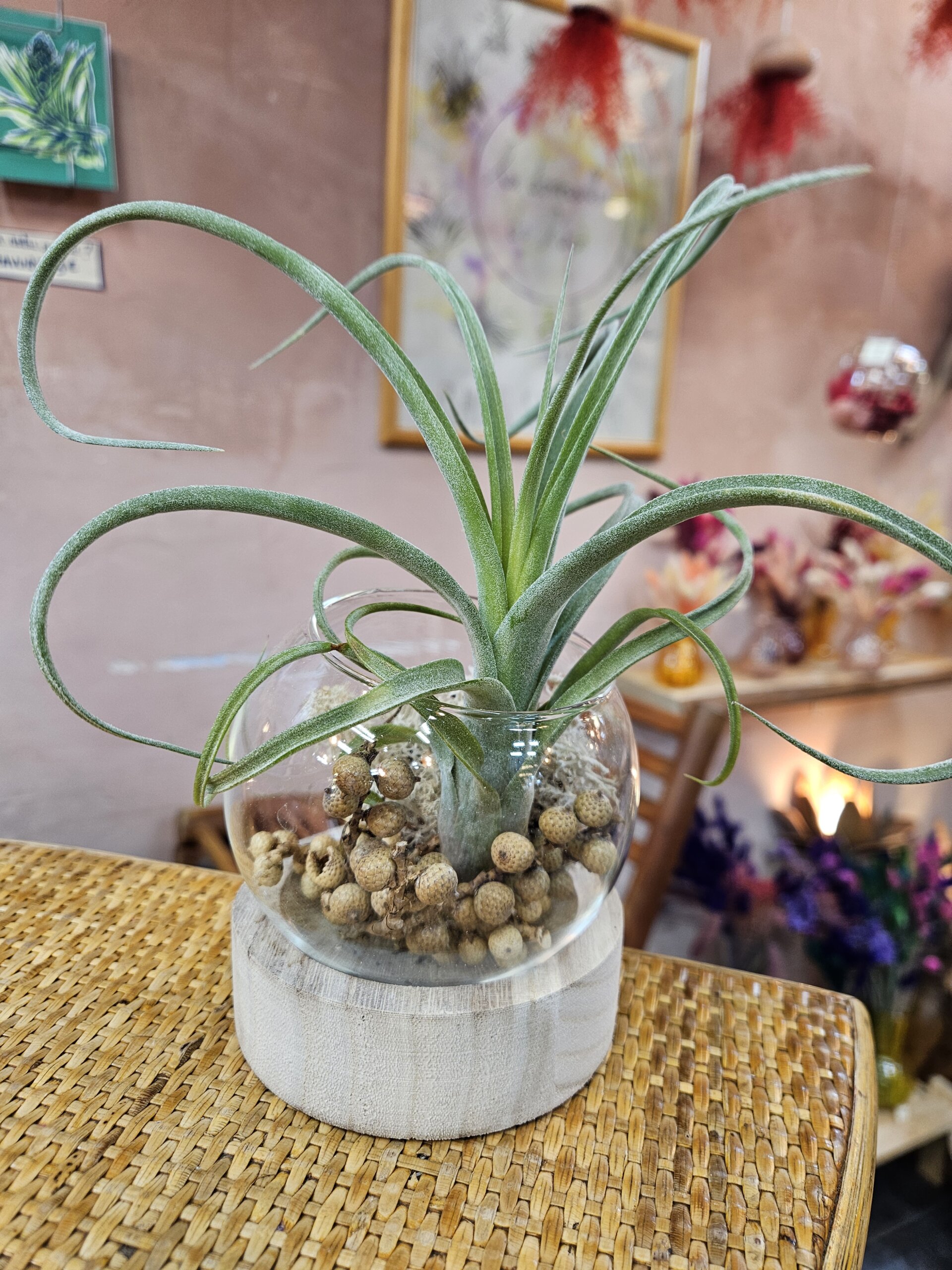 Le globe est en verre, d’un diamètre de 10 cm et posé sur un socle en bois. Il est garni du tillandsia curly slim, posé sur un lit de f-graines de canella et de lichen stabilisé.
