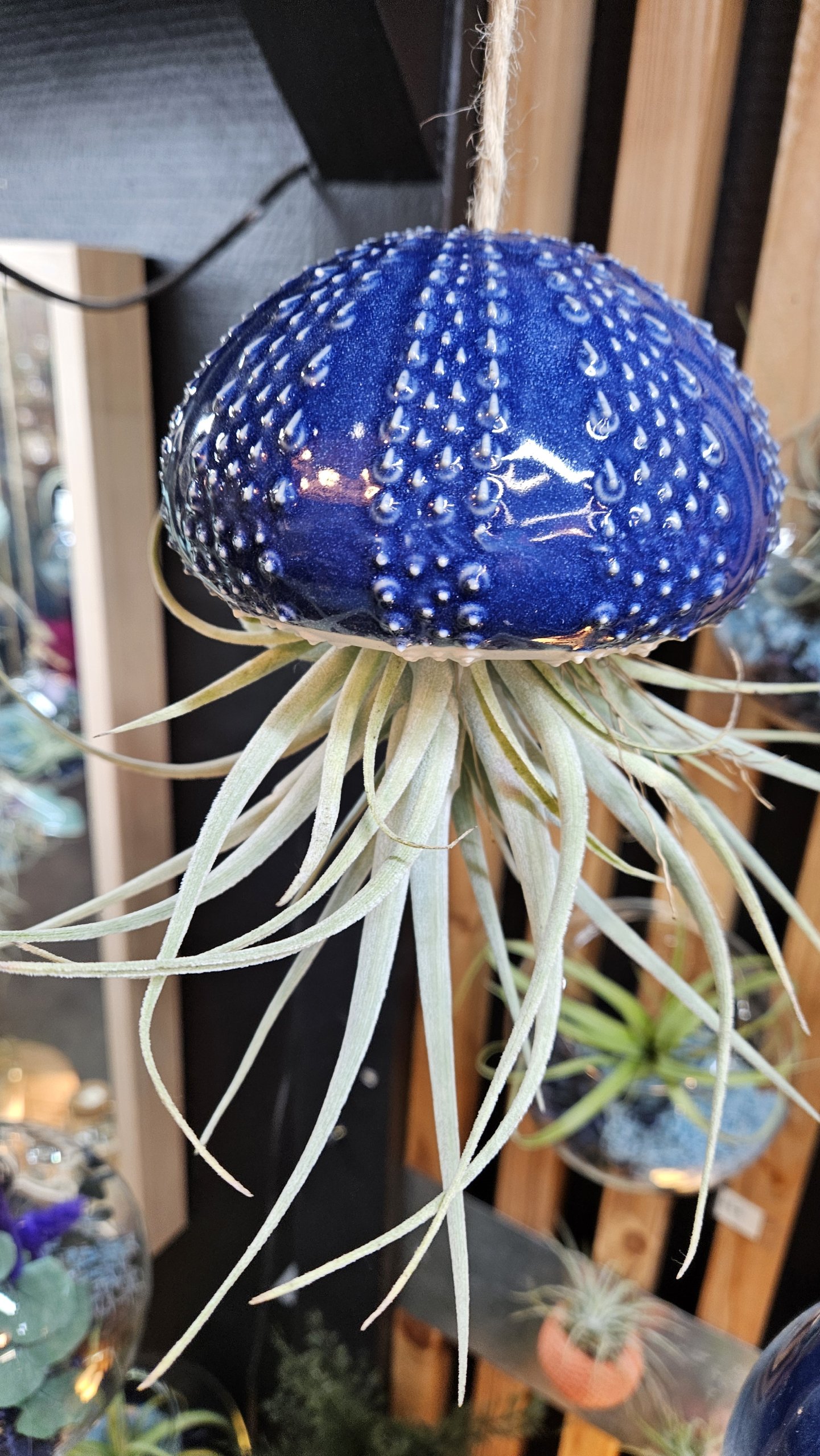 Ici associé au tillandsia pohliana, l’oursin se prend pour une méduse et nous plonge dans les fonds marins.